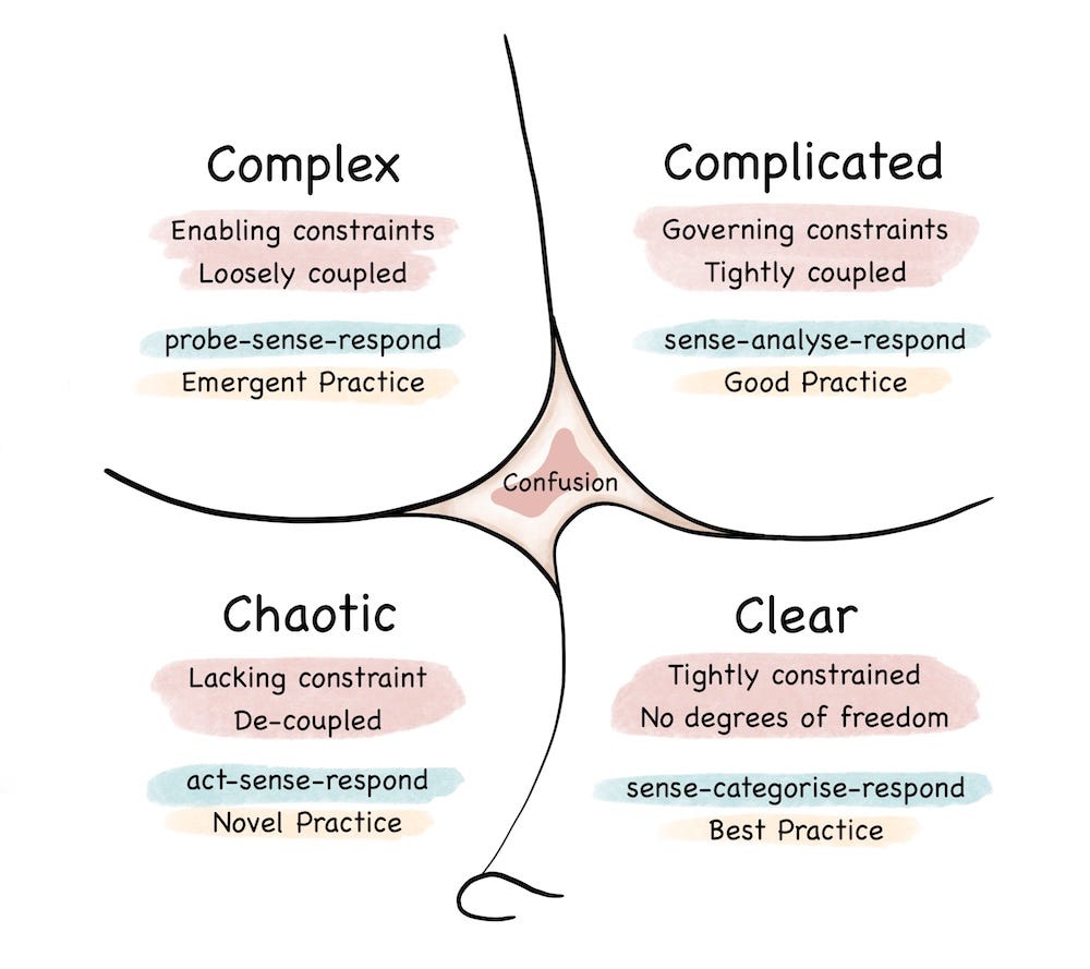 Dave Snowden’s Cynefin framework demonstrates the trap that most organisations are at risk of falling into. They’re treating all AI applications as if they live in the ‘clear’ or ‘complicated’ domains where best practices exist and answers can be found through analysis. This makes sense for where existing thinking or known information will suffice. But much strategic work lives in the ‘complex’ domain, where cause and effect relationships are less obvious, new thinking is required, and you need to probe-sense-respond. Here, the knowledge architecture is not about making information searchable on demand but providing diverse, sometimes contradictory, contextually rich knowledge that AI can synthesise and reason across to help you see patterns, generate scenarios, and identify assumptions you didn’t know you were making. The mistake is architecting all your knowledge for retrieval (clear or complicated) when your competitive battles are being fought in complexity.